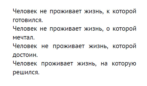 «Я поклянусь — клятвой, которую никогда не давал и никогда не потребую от других, — что я буду жить своим умом и своим трудом. И если меня попросят отчитаться, я скажу только одно: я никогда не буду жить ради другого человека и никогда не попрошу другого человека жить ради меня».