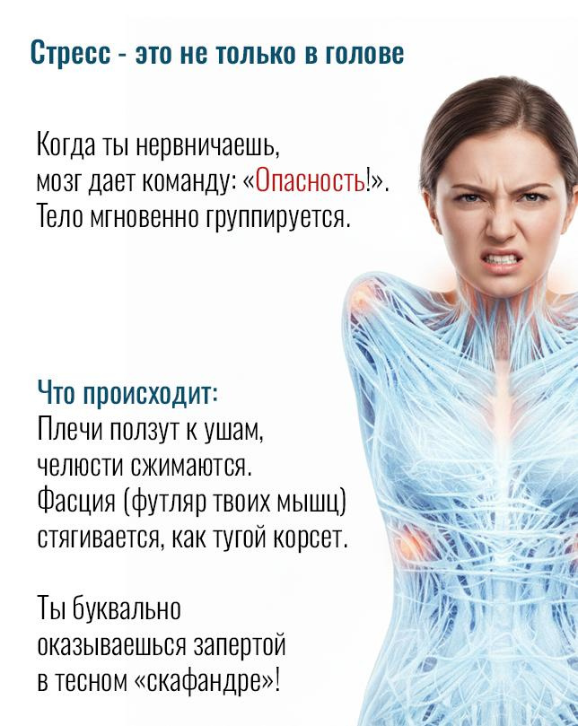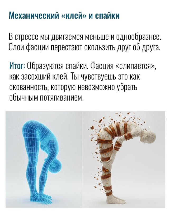 Если стресс становится затяжным, организм переходит в режим выживания на износ. Когда вы месяцами живете в состоянии «сжатой пружины», спайки в фасциях — это лишь малая часть беды.