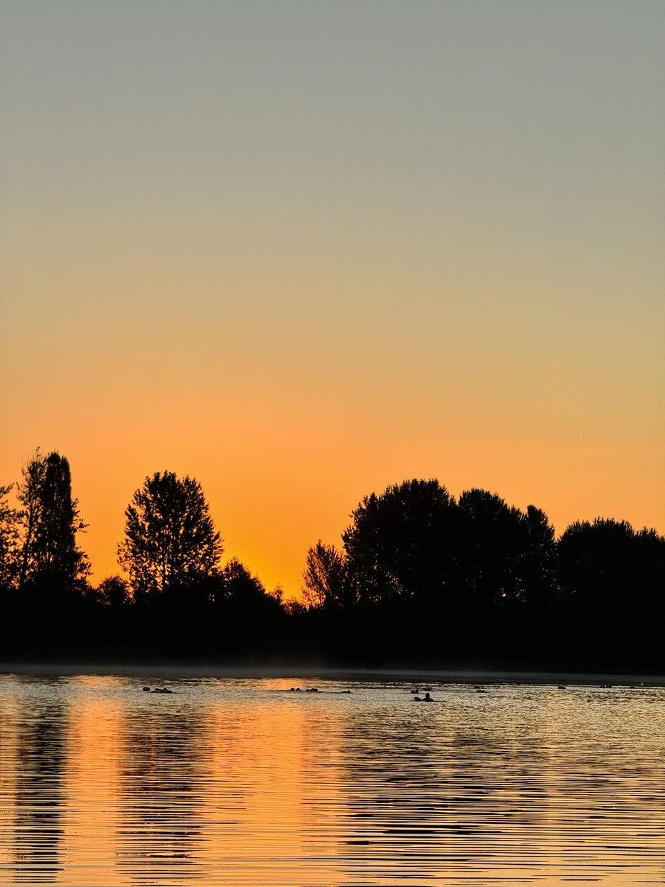 Это фото с тренировки по плаванию на рассвете. Все кругом спит, а ты плывешь и периодически следишь за ориентиром. С каждым гребком ты все больше согреваешь прохладненькую воду под гидрокостюмом. Постепенно расслабляешься и ловишь офигенное чувство скольжения. А останавливаясь, когда перестаешь слышать свои гребки, тебя завораживает плотная тишина водной глади. И в только просыпающемся мире, единственное живое - это тихо-тихо проплывающие рядом товарищи, которые скользят между водой и оранжевым от рассвета туманом
